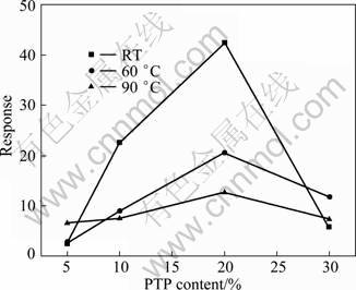 Figure 6 shows the response of 5%, 10%, 20% and 30% PTP/WO3 hybrids to 0.1%NO2 (volume fraction) at RT, 60 or 90 °C. It is found that the PW-20 hybrid has higher response to 0.1%NO2 (volume fraction) at RT than at 60 °C or 90 °C, and at all the three operating temperatures, the PW-20 hybrid shows the highest response among the PTP/WO3 hybrids.