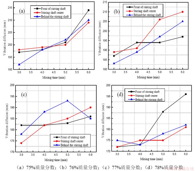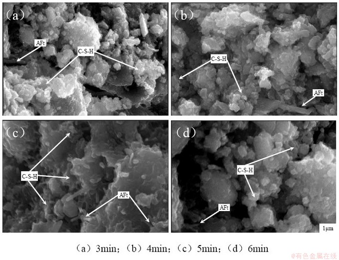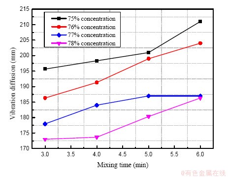 摘    要:搅拌时间是保证膏体拌合物均匀的最快捷且经济的方法。本文以金川矿区粗骨料及全尾砂为主要研究对象,采用全面实验的方法研究了固体质量分数、及搅拌时间对膏体表面状态、流动性及早期强度的影响,并结合SEM电镜扫描对不同搅拌时间条件下膏体强度的发生机制进行探讨。研究结果表明:搅拌轴不同位置的膏体振动扩散度并未呈现明显的规律性,对工业搅拌机不同位置膏体均质性的指导意义不大。随着搅拌时间增加,膏体振动扩散度越来越大,流动性逐渐得到改善。质量分数较大时会影响膏体物料混合的均质性,试验中质量分数为78%的充填物料,6 min的搅拌时间尚不足以得到密实均匀的高质量浆体。搅拌作用可以促进膏体内部结构的形成,充分的搅拌时间可以使得水泥在膏体中的分散提高,C-S-H凝胶产量增大,提高硬化膏体的早期强度,结合膏体制备工艺,建议搅拌时间在4~5 min。