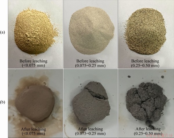 Fig. 5 Photos of ore samples with different particle sizes before (a) and after (b) leaching