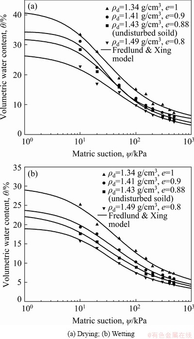 To study the effect of dry density on the soil-water characteristics of the ores, the dry density of the samples were set to be 1.34, 1.41 and 1.49 g/cm3, and the corresponding void ratio was 1, 0.9 and 0.8, respectively. The dry density of undisturbed soil was 1.43 g/cm3 and the void ratio was 0.88. The soil-water characteristic curves of the four samples with different dry densities are shown in Fig. 6. It can been seen that the soil- water characteristic curve not only reflects the relationship between soil matric suction and water content, but also reflects the pore state in soil. The effect of dry density on soil-water characteristic curve is shown by changing the pore condition of soil. Therefore, experimental observations indicate that with the decrease of dry density, the pore ratio of the sample increases gradually, and the inter-pore connectivity is better, so the saturated volume water content increases. At the same time, when the suction is low, the ore sample begins to lose water. On the contrary, the larger the dry density of the ores is, the closer the particles will be. The smaller the porosity is, the lower the saturated volume water content is, so the lower the penetrability will be. In the same matric suction, the volume water content decreases gradually with the increase of dry density, thus decreasing water holding capacity of ore accordingly.