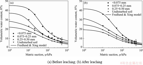 (3) Under the same matric suction, water content of rare earth ore samples decreases after solution leaching compared with that before solution leaching, indicating that solution leaching can decrease water holding capacity of ore. In both drying and wetting processes, water content of the ore after leaching changes less than that before leaching.