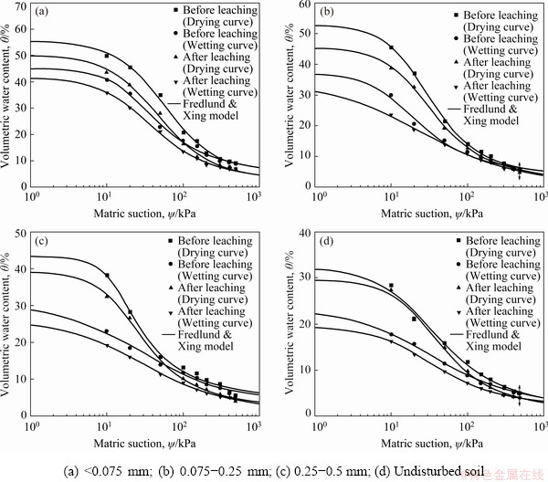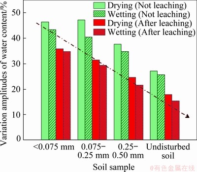 Variations of volume water content before and after solution leaching can be obtained from Fig. 9. Water content variation amplitudes of ores with particle size <0.075 mm are 46% (drying process) and 36% (wetting process) before solution leaching, which are decreased to 43% (drying process) and 35% (wetting process) after solution leaching. Water content variation amplitudes of ores with particle size ranging 0.075-0.25 mm are 47% (drying process) and 32% (wetting process) before solution leaching, which are decreased to 41% (drying process) and 29% (wetting process) after solution leaching. The water content variation amplitudes of ores with particle size ranging 0.25-0.5 mm are 38% (drying process) and 25% (wetting process) before solution leaching, which are decreased to 35% (drying process) and 22% (wetting process) after solution leaching. Water content variation amplitudes of undisturbed soil are 27% (drying process) and 18% (wetting process) before solution leaching, which are decreased to 26% (drying process) and 15% (wetting process) after solution leaching. It can be seen that water content of ores after solution leaching changes more slightly than that before solution leaching.