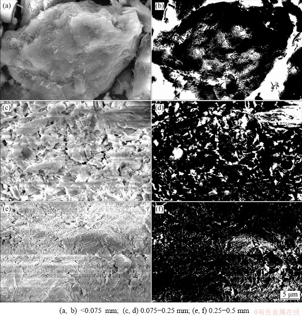 Based on the in-situ leaching engineering background, the water content of ore body is low in the early stage of leaching. For unsaturated soil with low water content and high suction value, suction is mainly affected by relatively short-range adsorption, which is strongly controlled by the surface properties of soil particles. Therefore, in the process of wetting and drying, the water holding behavior of the soil is mainly affected by the microstructure of soil particles, such as morphology, particle size, pore characteristics and interparticle relationship. In order to study the effect of the surface properties of soil particles with different sizes on the water holding behavior of ionic rare earth, three kinds of soil particles with particle size <0.075 mm, 0.075-0.25 mm and 0.25-0.5 mm were scanned and photographed with scanning electron microscope. Because the particle size of mineral soil is small, PCAS system [31] was selected to process and analyze the typical SEM images, as shown in Fig. 10, and the quantitative parameters of microstructure information are given in Table 3.