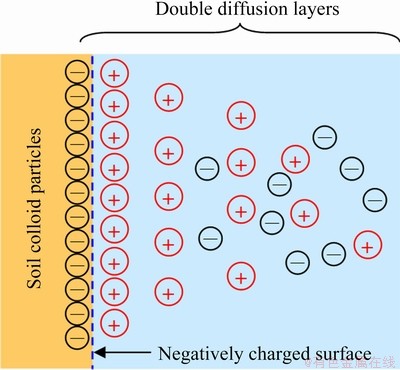 Clay particles can suspen in water rather than be dissolved in water. Clay ions have different electric properties in aqueous solution. In the structure of clay, Si4+ in the SiO2 tetrahedral layer might be replaced by Al3+ and Al3+ in the alumina octahedral layer might be replaced by divalent ions like Mg2+ and Fe2+. Due to such replacement, clay particle surface is negatively charged. Some cations, including K+, Na+, Ca2+ and RE3+, are adhered onto clay surface as a response to electrostatic attraction. These cations are actually hydrated cations. Hence, a negatively charged cation layer (counter-ion layer) corresponding to the positively charged hydrated cations is formed on clay particle surface. These two layers are called as the double electric layers (Fig. 12). The thickness of the double diffuse layers is related with valence number of ions in pore water, ion concentration, temperature and pH.