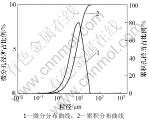 实验采用的钽粉由宁夏东方钽业有限公司生产,其主要化学杂质成分如表1所示,粒度分布如图1所示。粉末参数如下:钽粉纯度为99.92%,中位径为9.97 μm。聚氨酯泡沫由东莞展宇海绵厂生产,密度为25 kg/m3,孔隙直径0.85 mm,厚度10 mm。黏结剂采用聚乙烯醇([C2H4O]n),平均相对分子质量为127 745,纯度为97.0%。
