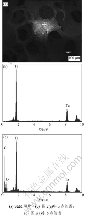 从能谱图中可以观察到:在孔壁部位(图2(b))基本没有杂质元素峰,而在孔隙边缘处(图2(c))出现了较明显的杂质元素峰。为了减轻杂质元素在孔隙处富集,在烧结过程中除了保持较高的真空度外,选用合适的聚氨酯泡沫也至关重要,一方面聚氨酯泡沫具有良好的回弹性,能保证浸渍完试样的形貌,起固定支撑的作用,另一方面它具有较低的软化温度在低温阶段它能完全分解排除掉,避免聚氨酯泡沫的分解产物在高温阶段与钽反应而生成难以分解的固溶体。