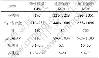 力学性能是评价骨科生物材料的重要标志[12],理想的骨科生物材料既具有良好的引导成骨功能,又能承受一定的载荷,抵抗一定的外力冲击。多孔金属的力学性能与致密金属相比主要取决于粉末粒度、孔隙率、孔隙形状、孔径及孔径分布等。