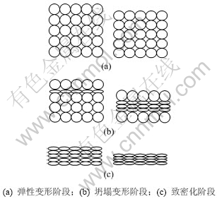 图4所示为模拟多孔钽试样在压缩过程中3个形变阶段的示意图,其中O表示孔隙,图5所示为多孔钽在压缩试验中的应力-应变曲线。