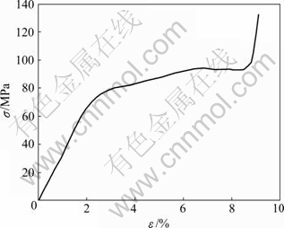由上述分析可知:用泡沫浸渍法制备的多孔钽的压缩应力-应变曲线符合典型泡沫金属的应力-应变曲线,即存在较长的应力平台可以对外来冲击起到很好的缓冲作用,避免了因外力冲击造成植入件的失效,延长其使用寿命。