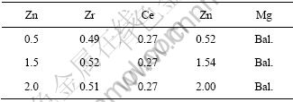 镁及镁合金是目前工业应用中最轻的结构材料,具有比强度高、比刚度大及减震性好等一系列优点,在工业应用尤其在汽车行业有良好的应用前景,正得到越来越多的关注和研究[1-2]。目前,工业镁合金产品大多通过铸造获得,包括高压、低压铸造、沙模铸造等传统方式以及挤压铸造、真空压铸和半固态压铸等新型铸造工艺[3]。与铸造相比,通过热变形得到的镁合金组织细密,铸造缺陷少且具有较好的综合力学性能,能够满足多样化的应用要求[4-5]。然而镁合金大多具有密排六方结构,变形能力及抗冲击能力差,而且在挤压(拉拔)变形过程中易形成(0001)面平行于挤压(拉拔)方向的丝织构,在轧制过程中形成(0001)面平行于轧面的板织构[6-7]。这样的合金通常具较高的拉伸屈服强度和较低的压缩屈服强度,具有较高的拉压不对称性和变形各向异性,二次变形能力差。在弯曲试验中,受压的一侧比受拉一侧率先失效,弯曲能力差。弱化基面织构以及晶粒细化是提高镁合金变形能力的主要方法。研究表明[8-9]:Y元素和稀土元素Nd、Ce的添加能够弱化镁合金挤压和轧制后的织构,使晶粒随机取向程度加大。MISHRA等[10]指出,在纯镁中添加0.2%(质量分数)Ce后,挤压态合金表现出明显的织构弱化,织构强度从约2.7下降到约1.5。晶粒取向随机化使得合金在变形中易于启动基面滑移,变形协调均匀,伸长率增高。但是Mg-0.2%Ce变形合金的强度太低(抗拉强度为68.6 MPa,屈服强度为170 MPa,伸长率为31%),达不到实际的应用要求。Al元素通常被用于强化镁合金,但是Al元素容易与Ce元素结合形成Al11Ce3,削弱Ce元素的织构弱化作用[11]。Zn元素被广泛地应用于镁合金中来提高铸态和变形态的强度,Zn的添加能提高Mg-Nd合金和Mg-Y合金的强度[12]。LUO等[11]在Mg-0.2%Ce中分别添加2.4%、4.9%、7.6%Zn元素,对比研究发现,Zn元素能大幅度提高合金的强度,但随着Zn含量的增加,伸长率有所降低。Zn含量过高,反而降低稀土元素弱化织构的作用,Zn含量为2.4%时,合金有较好的综合性能。Zr元素能够有效细化铸态合金晶粒,提高强度。JAN等[9]的研究表明,Zr元素添加对于变形镁合金织构变化影响较小。为了充分获得粒子强化、晶粒细化和基面织构弱化的效果,综合提高合金的强度和塑性,本文作者在Mg-0.3%Ce合金中添加一定量的Zr元素和不同含量的Zn元素(0.5%、1.5%、2.0%),对比研究不同当Zn含量(<2.0%(质量分数))Mg-Zn-Ce-Zr合金的微观组织及力学性能。