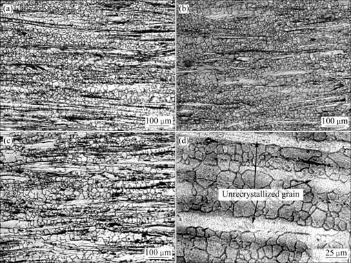 Fig.3 Microstructures of as-extruded alloys: (a) 0.5%Zn; (b) 1.5%Zn; (c) 2.0%Zn; (d) 1.5 %Zn