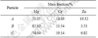 图6所示为铸态及挤压态合金中析出相的形貌。表2所列为不同状态下析出相的EDS成分分析结果。由表2可知,析出相主要含有Mg、Zn、Ce元素,且Zn、Ce元素均超过了其在合金中的平均含量,可见,铸态时Zn、Ce元素主要以非常稳定的Mg-Ce化合物和Mg-Zn化合物[13-14]或以Mg12(Zn)Ce化合物形式存在于晶界上[15]。在热挤压变形过程中,这些析出相破碎并沿着挤压方向排布,在变形过程可能作为形核质点促进动态再结晶形核并抑制晶粒长大,变形后亦可作为颗粒增强相而提高合金的性能。