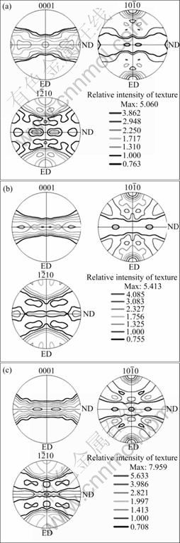 Fig.7 Pole figures and relative intensity of texture of as-extruded alloys: (a) 0.5%Zn; (b) 1.5%Zn; (c) 2.0%Zn