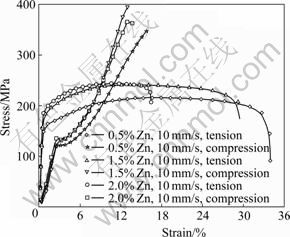 Fig.8 Tension and compression test strain—stress curves of alloys with different Zn contents