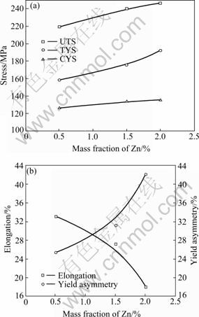 Fig.9 Mechanical properties of as-extruded alloys: (a) UTS, tensile-YS and compression-YS; (b) Elongation and yield asymmetry
