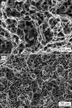 图10所示为含1.5%Zn合金挤压态室温断口形貌。由于不同Zn含量合金断口形貌差别不大,仅列出1.5%Zn含量合金断口形貌。由图10可以看出,断口主要由韧窝和小的解理平台组成,韧窝裂纹源主要由滑移过程中位错塞积或者存在异质颗粒产生孔洞而引发的,解理平台则多由孪晶变形引起。随着织构弱化程度加大,有更多的基面滑移能在室温下启动,从而提高了合金的伸长率。
