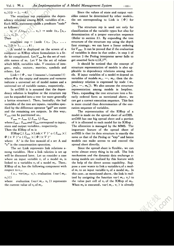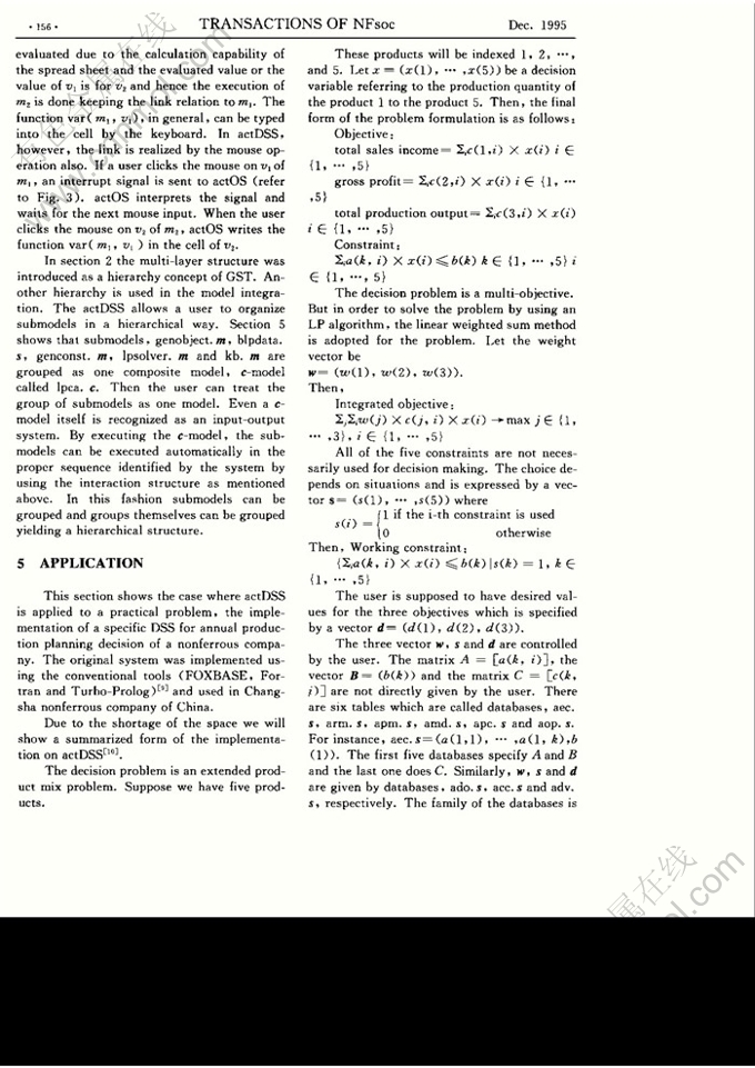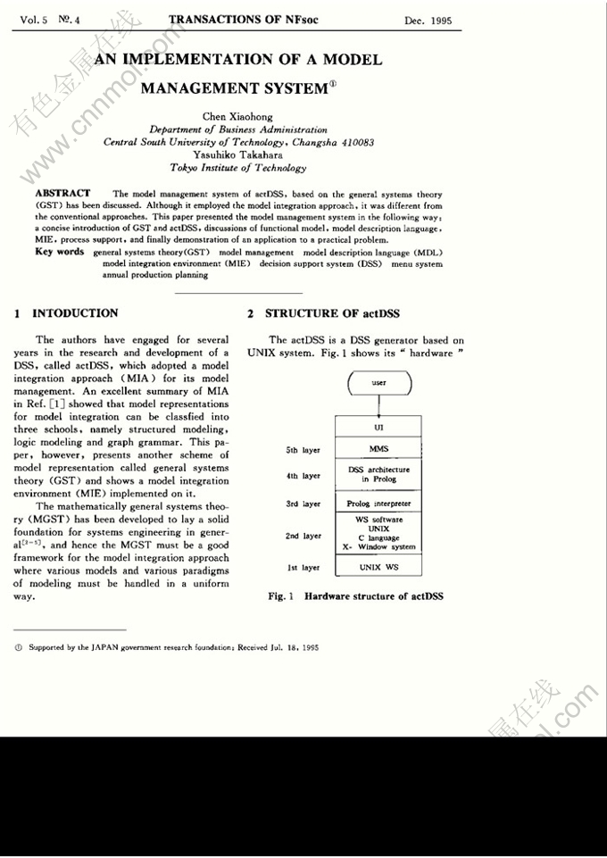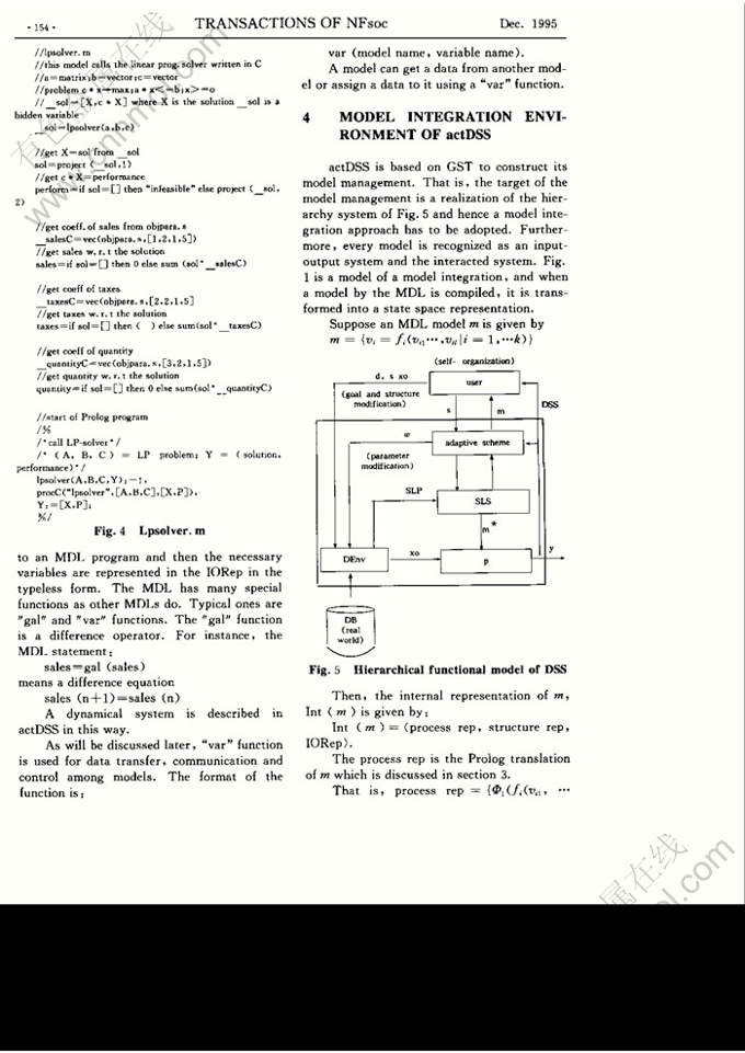 Abstract: The model management system of actDSS,based on the general systems theory(GST) has been discussed.Although it employed the model integration approach,it was different from the conventional approaches.This paper presented the model management system in the following way:a concise introduction of GST and actDSS,discussions of functional model, model description language,MIE,process support,and finally demonstration of an application to a practical problem.