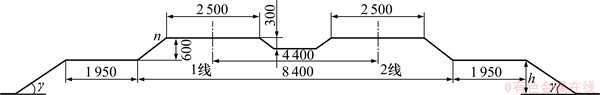 路基的常见结构形式有路堤和半路堤路堑。文献[11]的研究表明:半路堤路堑对线路上方气流的加速作用有限,由此引起的线路上方风速的增大导致车辆发生危险的可能性不是很大。为此,本文以普通路堤的外形为例进行研究。路堤外形见图1,其中:h为路堤高度,此处取为10 m;γ为路堤斜面与水平面的夹角;“n”为线路最左侧端点。