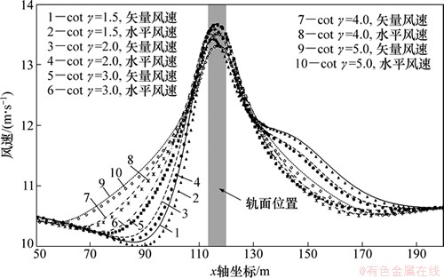 从图4可以看出:路堤对气流有加速作用,风速在经过爬坡加速后均在轨面上方达到最大值,而后逐渐减小,风速分布近似呈抛物线形;各工况中速度矢量大小和水平分量差别不大,即来流为水平方向时,经过路堤的阻滞与加速作用,垂向分量相对水平分量很小,尤其是在轨面上方,曲线几乎重合;随着cot γ的增大(路堤斜率减小),两者之间差别趋于减小。为此,采用水平测风仪来推导线路上方风速造成的误差越小;气流在轨面前方受到路堤的阻滞,在靠近路堤的地方风速会降低,之后迅速增大。由于在驻点处风速变化率为0,坐标处位置的微小变化并不会导致风速发生较大变化。因此,建议在此位置处安装测风站,可以有效避免安装误差引起的测量风速的偏差。图4也说明:无论测风站安装在上风区还是下风区,其读数均远小于线路上方的风速,据测风站所测风速对列车速度限制管理会影响到列车的安全运行。
