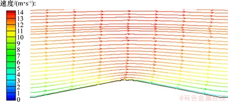 Fig. 5 Flow streamlines and wind speed distribution around embankment when cot γ=1.5