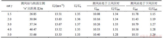 从表1可以看出:随着cot γ增大,风速驻点所处位置与轨面左侧“n”点的距离Xr越来越大,而Ur与Umu的比值越来越小,Ur与Umd的比值则有所增大。通过曲线拟合可得测风站风速、气象站风速与线路上方最高风速的关系: