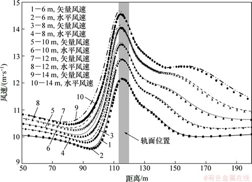 图4 轨面上方4.5 m高处水平线上的风速分布