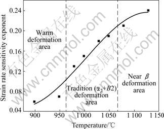 求出。图2所示为峰值应力与应变速率的双对数关系。从图2中可以看出,不同变形温度下,峰值应力的对数与应变速率的对数基本呈线性关系。图2中各线段的斜率即为相应温度下的应变速率敏感因子m,经计算得出的应变速率敏感因子m在整个实验温度范围内是变化的(见图3)。变形温度为900 ℃和950 ℃(≤tb-185,℃)的范围内,m值相近,其平均值为0.069。表现出温加工的特征,称为温变形区间。温度在980~1 050 ℃(tb-155~tb-85,℃)的范围内各温度下的m值分别为0.132、0.151、0.184、0.185,相差不大,平均值为0.163。与大多数钛合金在此温度和应变速率范围内的m值相同[15],称为传统(α2+B2)变形区间。温度为1 080 ℃和1 130 ℃(≥tb- 55,℃)的近β转变温度的变形范围内,m值达到最大值,其平均值为0.225,简称为近β变形区间。