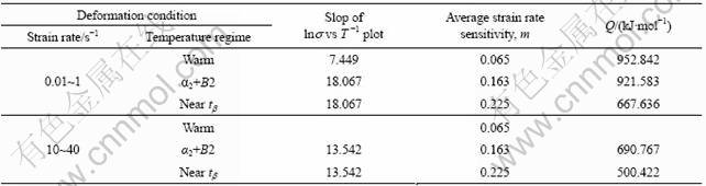 根据公式(5)~(6)可知,图4中直线的斜率为mQ/ 1 000 R,从而可以计算出变形激活能Q值,如表2所示。其中,变形温度在近β转变变形区间(≥tb-55,℃)内,应变速率为10-2~1 s-1时,应变速率敏感因子m=0.225和变形激活能Q=667.636 kJ/mol与HUANG在研究超a2合金的热变形时与本研究相同变形条件下求得的结果相近(m=0.263, Q=620.65 kJ/mol)[16];应变速率为10~40 s-1时的应变速率敏感因子m=0.225和变形激活能Q=500.422 kJ/mol与HUANG等[11]对超β2合金的另一个工作的结果相当(m=0.29, Q=414 kJ/mol),其变形条件为温度1 050 ℃,应变速率1~100 s-1。变形温度在传统(α2+B2)变形区间(tb-155~tb-85, ℃)内、应变速率为10-2~1 s-1时的应变速率敏感因子m=0.163和变形激活能Q=921.583 kJ/mol和变形温度在温变形区间(≤tb-185,℃)、应变速率为10-2~1 s-1时,应变速率敏感因子m=0.065和变形激活能Q= 952.842 kJ/mol分别与SEMIATIN等[17]在研究铸态Ti-24Al- 11Nb合金时的结果相近(热变形:10-3~10 s-1,m=0.175,Q=1 080 kJ/mol;温变形:10-3~1 s-1,m= 0.075,Q=815 kJ/mol)。说明本研究关于应变速率敏感因子m和变形激活能Q的计算结果是可信的。