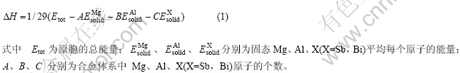 本文采用下式计算Sb、Bi合金化前后Mg17Al12原胞模型平均每个原子的合金形成热(?H) [10?11]: