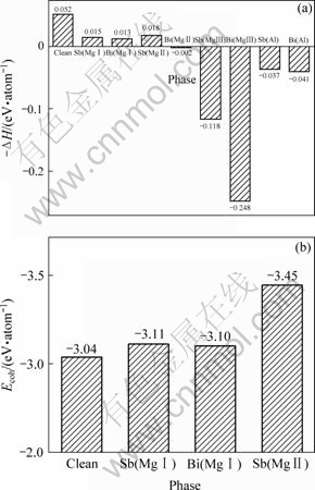 图2 Sb、Bi合金化前后Mg17Al12相的负合金形成热(?ΔH)和结合能(Ecoh)