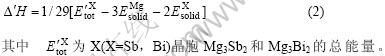 袁广银等[2?3]对Mg-Al系合金进行Sb或Bi合金化,发现除有连续沉淀相Mg17(Al,Bi)12析出外,Bi还形成了金属间化合物Mg3Bi2;而Sb除固溶于Mg17Al12外,还形成了金属间化合物Mg3Sb2,袁广银等实验结果[2?3]证实了上面计算分析得出的结果。为此,采用式(2)计算了金属间化合物Mg3Sb2和Mg3Bi2的合金形成热(?′H):