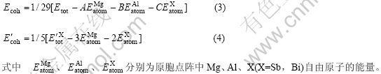 为进一步比较Sb, Bi合金化Mg-Al系合金形成上述结构稳定存在相的结构稳定性大小,本文分别采用式(3)和(4),计算了Sb分别置换Mg17Al12相中Mg(Ⅰ)和Mg(Ⅱ) 原子,Bi置换Mg17Al12相中Mg(Ⅰ)原子所形成结构稳定存在的Mg17Al12固溶体的结合能(Ecoh)以及金属间化合物Mg3Bi2和Mg3Sb2的结合能(