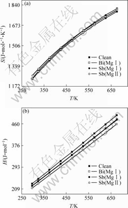 Fig.3 Entropy(S)(a) and Enthalpy(H)(b) of Mg17Al12 phase under different temperatures with and without Sb or Bi addition (Clean, Sb(MgⅠ), Bi(MgⅠ), Sb(MgⅡ) denote Mg17Al12, (Mg16Sb)Al12, (Mg16Bi)Al12, (Mg13Sb4)Al12 phases, respectively)