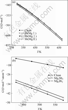 Fig.4 Gibbs free energy of Mg17Al12 phase under different temperatures with and without Sb or Bi addition and Per atom Gibbs free energy of Mg17Al12 phase, Mg3Bi2 and Mg3Sb2 under different temperatures (Clean, Sb(MgⅠ), Bi(MgⅠ)、Sb(MgⅡ) denote Mg17Al12, (Mg16Sb)Al12, (Mg16Bi)Al12, (Mg13Sb4)Al12 phases, respectively)