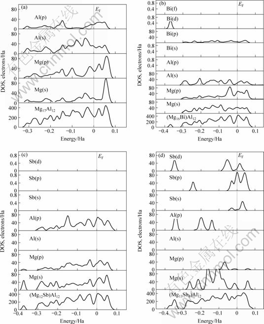 Fig.5 DOS of Mg17Al12 phase with and without Sb or Bi addition: (a) Mg17Al12; (b) (Mg16Bi)Al12; (c) (Mg16Sb)Al12; (d) (Mg13Sb4)Al12