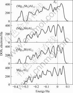 进一步比较图6可见,Mg17Al12相的主要成键峰分布在0.1~?0.35 Ha范围内,Bi合金化置换MgⅠ原子后,(Mg16Bi)Al12主要成键峰仍然分布在0.1~?0.35 Ha范围内,且成键峰的高度变化不大,但在?0.35~?0.40 Ha范围内,出现了一个新成键峰,峰值高度为:107.142 9个电子状态/Ha,即Mg17Al12相Bi合金化后在低能级区成键电子数增多,因此Bi合金化后体系结构变得更加稳定[18?19]。而Sb合金化置换 MgⅠ原子后,(Mg16Sb)Al12相主要成键峰的分布范围与成键峰高度与Bi合金化情形类似,因此合金体系结构同样变得更加稳定;但Sb合金化置换MgⅡ原子,(Mg13Sb4)Al12相主要成键峰虽然仍然在0.1~?0.35 Ha范围内,但成键峰的高度增大,特别是在?0.35~?0.40 Ha的范围内,出现了一个更高的新成键峰,峰值高度达243.622 4个电子状态/Ha。与未合金化、Bi、Sb合