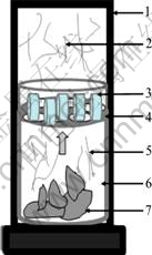 Fig. 2 Schematic illustration of experimental apparatus: 1—Graphite crucible; 2—Ca vapor; 3—(TiO2+CaCl2) pieces; 4—Stainless crucible A; 5—Ca vapor; 6—Stainless crucible B; 7—Ca