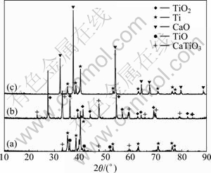 图3(a)所示为不添加CaCl2在1 273 K下还原时间6 h时还原产物经酸洗后的XRD谱。可见,还原产物中除存在Ti外还有未被完全还原的TiO和CaTiO3。图3(b)所示为在添加CaCl2(m(CaCl2):m(TiO2)=1:4)后于1 273 K下烧结2 h产物的XRD谱。可以看出,经烧结后也有CaTiO3生成。将烧结产物在1 273 K下还原6 h后产物中的CaTiO3完全消失,最终产物只有CaO和Ti(见图3(c))。