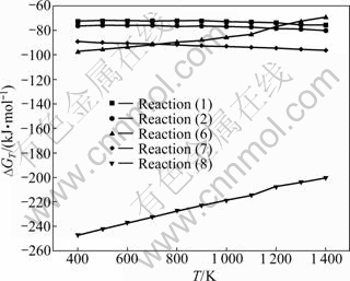 Fig. 4 Relationship between ?GT and T of reactions (1), (2) and (6)-(8)