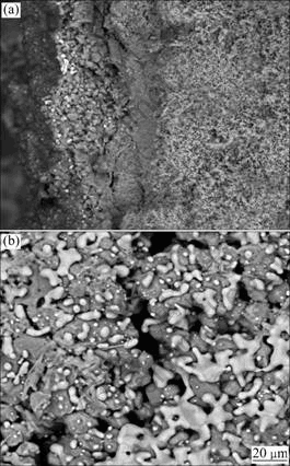 图8所示为m(CaCl2):m(TiO2)=1:4时在1 273 K烧结2 h后产物的SEM像。从图8(a)可以看出,物料表面及内部存在大量的孔隙且分布较均匀,这主要是因为在1 273 K下,CaCl2大量挥发以及CaCl2·2H2O水解放出气体,有效地增大了气-固还原反应的接触面积。当CaCl2的加入量增大时(如m(CaCl2):m(TiO2)= 1:1.5),从图8(b)中可以看出,基本没有孔结构,这是由于大量的CaCl2会与CaO形成固熔体[20]。当加入大量的CaCl2后,除了有利于形成CaTiO3外,形成的大量固熔体将阻碍钙蒸气向块体内部扩散,抑制气-固还原反应。