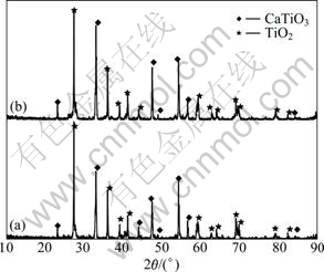 Fig. 7 XRD patterns of sintered products with different amounts of CaCl2 (T=1 273 K, t=2 h): (a) m(CaCl2):m(TiO2)= 1:4; (b) m(CaCl2):m(TiO2)=1:1.5