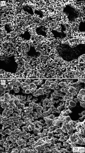 Fig. 8 SEM images of sintered products with different amounts of CaCl2 (T=1 273 K, t=2 h): (a) m(CaCl2):m(TiO2)= 1:4; (b) m(CaCl2):m(TiO2)=1:1.5