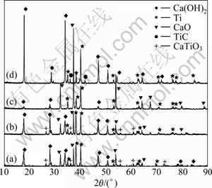 图9所示为1 273 K、还原时间分别为1、4、6和8 h及m(CaCl2):m(TiO2)=1:4时得到的还原产物的XRD谱。图9(a)和(b)所示分别为反应时间为1和4 h还原产物的XRD谱。可见,产物中除了副产物CaO及部分CaO吸水生成的Ca(OH)2和还原产物金属钛外,还有少量的CaTiO3,说明CaTiO3是TiO2→Ti4O7→ Ti3O5→Ti2O3→TiO→Ti转化过程中的产物,这与前面反应式(1)~(8)的热力学分析结果是一致的。当还原时间较短时,CaTiO3未能完全被钙蒸气进一步还原成金属钛而存在于产物中。