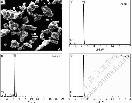 Fig. 11 SEM image (a) and EDS analysis results ((b)-(d)) of titanium powders at points 1-3