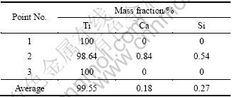 由于在钙热还原TiO2过程中,CaTiO3主要来源于CaCl2水解产物CaO与TiO2烧结反应,这将有助于TiO2被还原成金属钛,但考虑到添加剂CaCl2的挥发作用,因此,要适当控制CaCl2的含量。将m(CaCl2): m(TiO2)=1:4的片状混合物在1 273 K还原6 h,还原产物经酸洗和干燥,得到的最终产物的XRD谱如图10所示。其各衍射峰均与PDF卡片中(65-9622)的衍射峰一致,表明得到的产物为六方晶胞的金属钛粉。对其进行SEM分析,并任取3个不同的点利用EDS对其成分进行表征,结果如图11所示。由图11可以看出,钛粉颗粒具有不规则的外形,颗粒尺寸为8~15 μm。3个点的成分如表2所列,表明钛含量(质量分数)≥99.55%。由于原料为颜料级TiO2,所以,还含有Ca和Mg等元素。