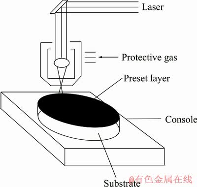 选用TC4钛合金为实验基材,并将钛合金切割成圆片状,圆片直径30 mm,圆片长度15 mm。将圆片端面用水砂纸进行逐级打磨成光滑面,并用无水乙醇清洗光滑面,以保证圆片端面无残留的氧化物和油污等杂质。选用质量分数为99.5%的TiB2粉末(晶粒尺寸5 μm)与质量分数为99.0%的Ni粉末(晶粒尺寸5 μm)为熔覆材料。为了降低熔覆材料的流失率,采用少量的 2123 酚醛树脂为粘接剂。将TiB2粉末与 Ni+TiB2粉末(n(Ni):n(TiB2)=1:1)分别预置于试样的圆片端面上, 预置涂层厚度控制为0.4 mm。然后,将预置层放置烘干箱进行烘干,温度与烘干时间分别设置为120 ℃和5 h。激光器选用YLS-6000型IPG光纤激光器,保护气选用Ar,流量设置为15 L/h。选用的激光工艺参数为: 激光功率P为1~5 kW, 激光束扫描速率v为3~10 mm/s, 光斑尺寸D为5 mm (类圆形光斑)。激光熔覆的试验方法,如图1所示。