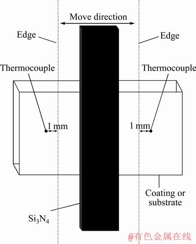 采用MM-200型环块式磨损试验机进行复合涂层的干滑动摩擦磨损试验,实验参数如表1所示。采用FTM200微振动摩擦磨损试验机进行复合涂层的微动摩擦磨损测试,摩擦过程中的接触形式为线-面接触,实验参数如表2所示。采用多点热电偶对摩擦磨损近接触区的温度进行测试,测温试验方法,如图2所示。试样磨损后,磨痕形貌采用扫描电镜(SEM)观察,复合涂层和基材的磨痕轮廓采用Mahr-M1型轮廓仪进行测量,且根据以下公式计算微动磨损体积,公式为