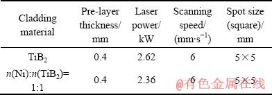 为了对比研究引入NiTi合金前后对TiB短纤维复合涂层抗微动磨损性能的影响,以TiB2和Ni+TiB2分别为熔覆材料,在钛合金表面采用激光原位熔覆制备两类复合涂层。经正交参数试验,工艺参数优化结果如表3所示。