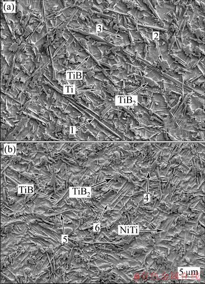 1) Ni添加前,钛合金表面激光原位熔覆TiB2粉可制备出TiB2颗粒与TiB短纤维增强钛基复合涂层;Ni添加后,通过激光原位熔覆制备出NiTi合金填充在TiB2颗粒与TiB短纤维周围,但TiB2颗粒尺寸和TiB短纤维长度都得以减小。
