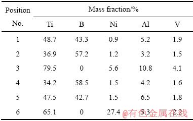 激光熔覆后,采用电火花线切割、研磨、抛光,用体积比为V(HNO3):V(HF):V(H2O)=3:2:95的腐蚀剂腐蚀后, 利用JSM-6490LA型扫描电镜(SEM)观察复合涂层横截面的微观组织。采用D/max 2550 VL/PC型X射线衍射仪(XRD)对复合涂层表面进行物相识别。由于B元素是低原子序数,能谱不能定量检测出其含量,本研究采用JXA-8100型电子探针(EPMA)对显微组织中相种类进行分析。